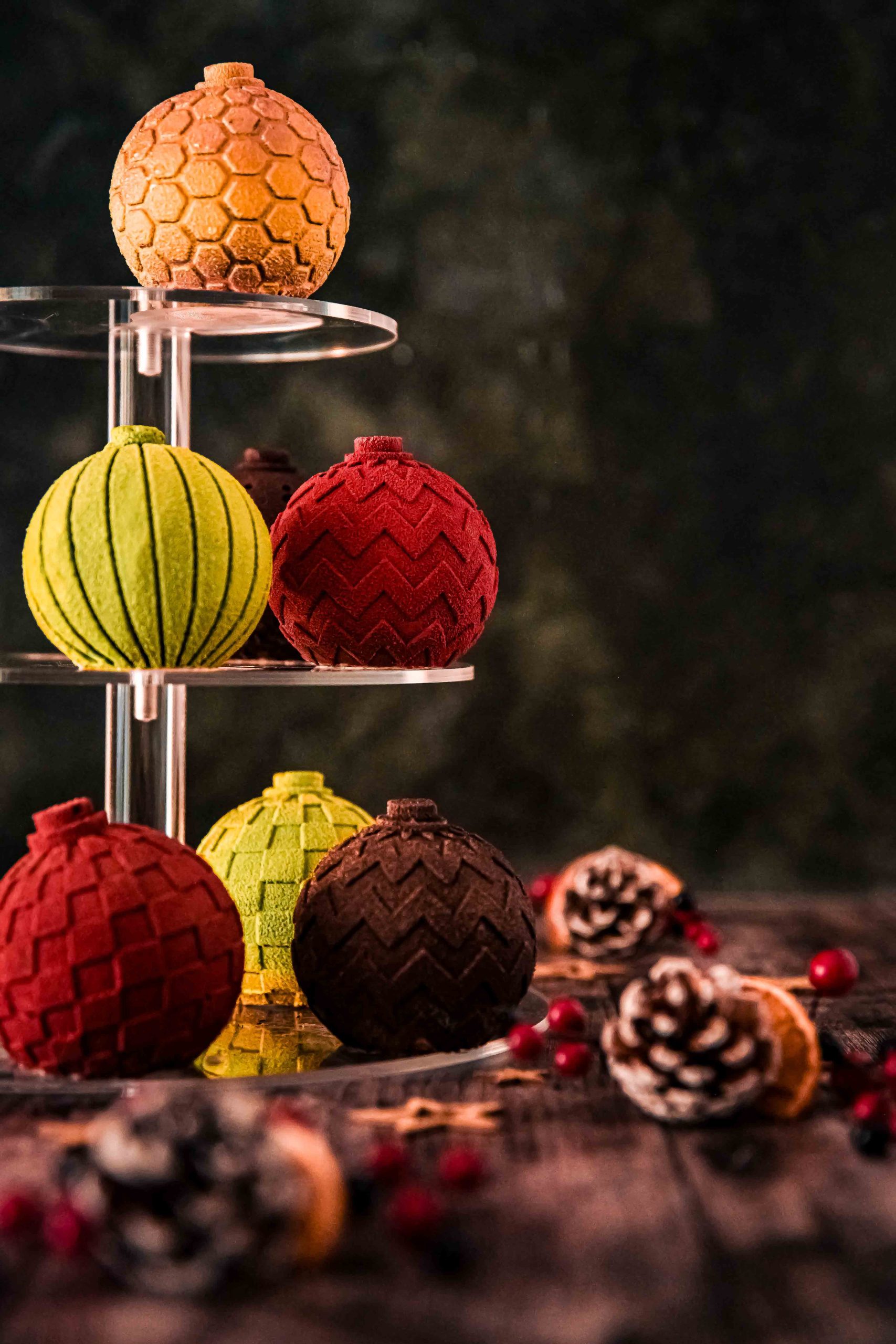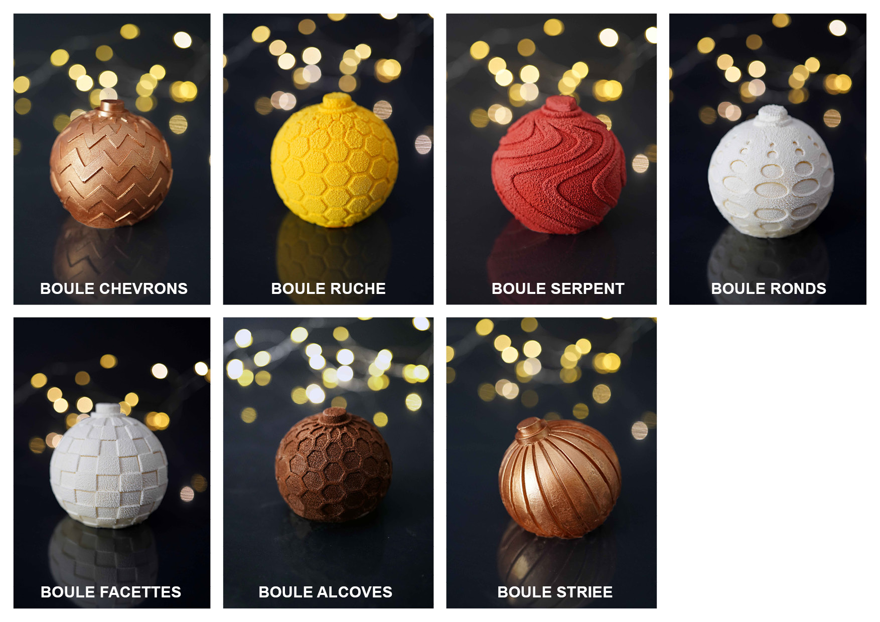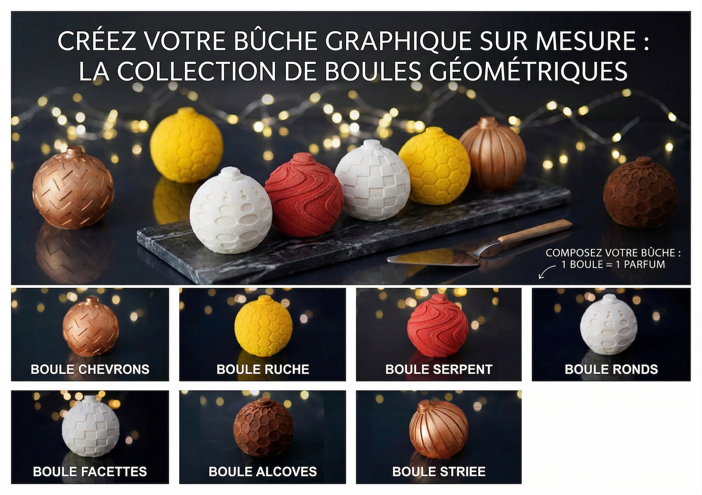 Le concept ? Une boule, un parfum, une émotion. Fini la découpe parfois périlleuse : avec cette collection, vous composez une bûche modulaire et audacieuse. En alignant ces différentes sphères, vous créez un dessert spectaculaire où chaque invité découvre sa propre sculpture éphémère. C’est l’occasion idéale de jouer sur les textures et les saveurs : une boule aux agrumes, une autre au chocolat intense, une troisième au praliné… votre créativité est la seule limite.